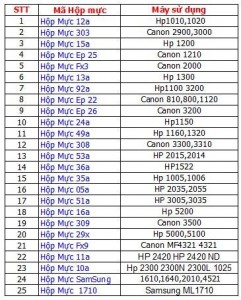 Công ty TNHH Tăng Phú. Gửi tới các bạn một số mã hộp mực máy in thông dụng ở thị trường Việt Nam , Để tiện tra cứu khi cần thiết khi đổ mực máy in cho khách hàng. Tránh những nhầm lẫn đáng tiếc có thể xảy ra.